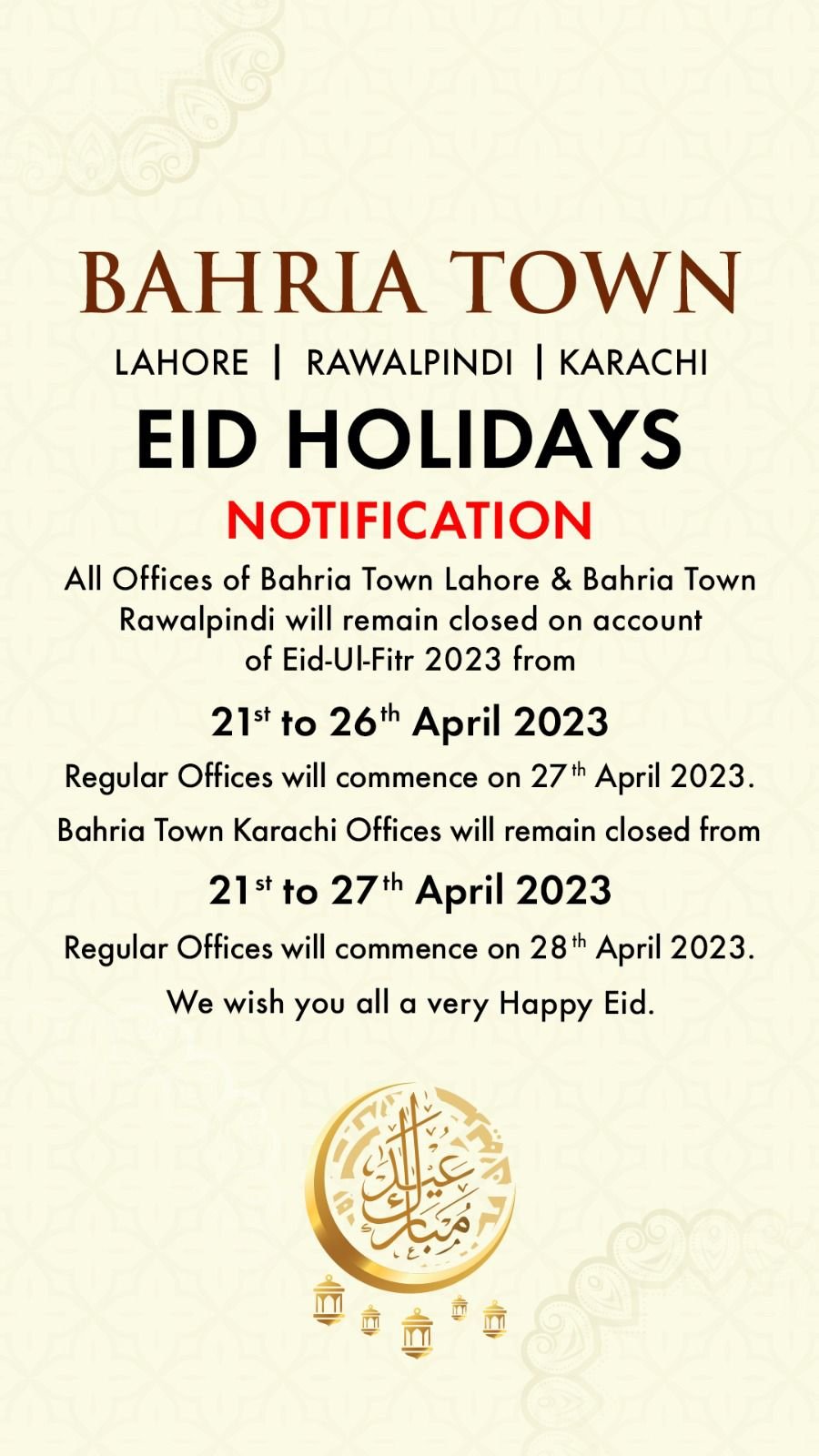 Bahria Town, one of Pakistan’s largest real estate developers, has announced the Eid Holidays for 2023 in Lahore, Rawalpindi, and Karachi. In line with the government’s notification, all offices of Bahria Town Lahore and Bahria Town Rawalpindi will remain closed from 21st to 26th April 2023 on account of Eid-ul-Fitr. Operations Department (Transfers etc) activities will commence on 27th April 2023 while regular offices will resume from 2nd Mat 2023. Similarly, all offices of Bahria Town Karachi will remain closed from the 21st to the 27th of April 2023, and Operations Department (Transfers etc) will commence from the 28th of April 2023 while regular offices will open from 2nd May 2023.
