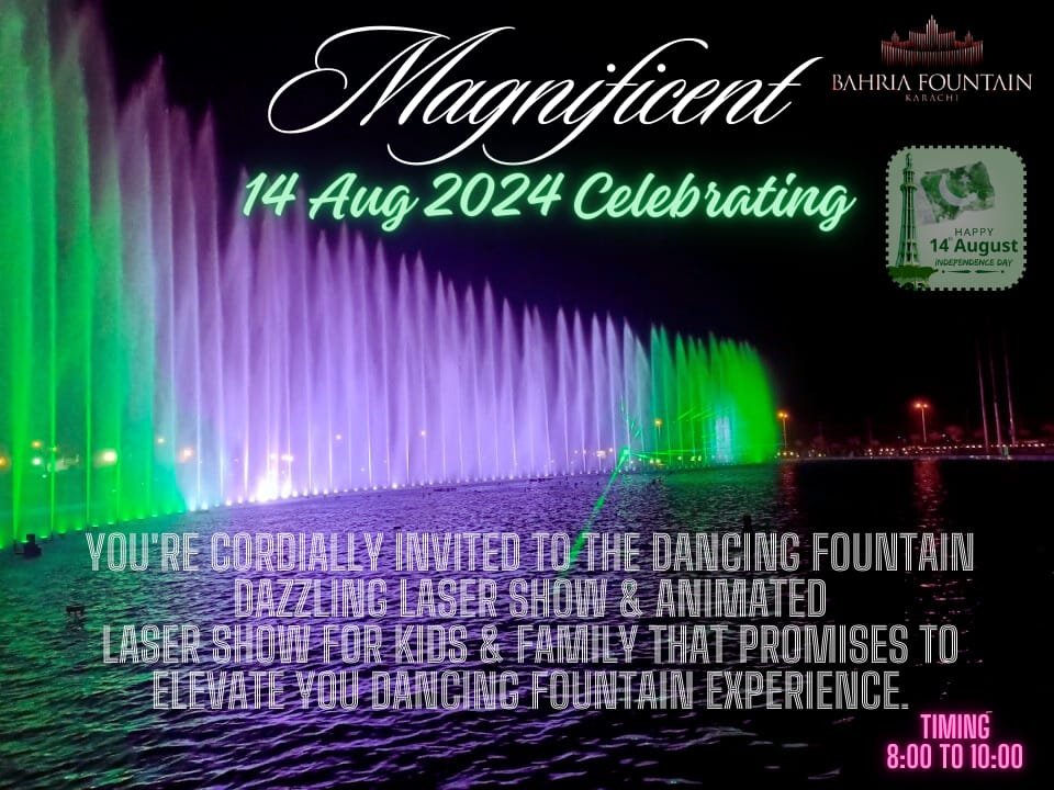 Bahria Town – Bahria Town Karachi is set to host an extraordinary celebration on 14th August 2024, in honor of Pakistan’s Independence Day. The event will feature a series of breathtaking laser and dancing fountain shows at the Bahria Town Karachi Dancing Fountain, promising an evening of patriotic fervor and entertainment.